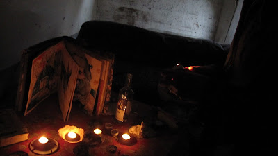 Lauri disappears, I put the headphones on and open a bottle of cheap redwine I brought with me. I think about drunks, power cuts, Russia, rabbits, woods. The chair I sit on is soft and comfortable and I actually don't feel cold at all. They've carried some sofas here too.. And what's that thing hanging from the ceiling? Man, this dim candlelight and all .. Lauri brings me a pullover and goes away again, I start watching the film.